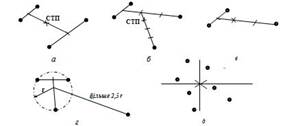 Рис. 1. Визначення середньої точки попадання: а, б - по чотирьох пробоїнах; в - по трьох пробоїнах; г - визначення пробоїни, що відірвалася; д - при стрільбі автоматичним вогнем. Точка розподілу, найближча до перших двох пробоїн, і буде середньою точкою попадання. Якщо всі чотири пробоїни не вміщаються в зазначений габарит, СТП дозволяється визначати по трьох більш кучно розташованих пробоїнах за умови, що четверта віддалена від СТП трьох пробоїн більш ніж на 2,5 радіуса кола, що вміщає ці пробоїни (рис. 1 г).