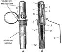 Малюнок 3. Запал гранати УЗРГМ (УЗРГМ-2): а) загальний вигляд; б) у розрізі; 1) трубка ударного механізму; 2) з’єднувальна втулка; 3) направляюча шайба; 4) бойова пружина; 5) ударник; 6) шайба ударника; 7) спусковий важіль; 8) запобіжна чека; 9) втулка сповільнювача; 10) сповільнювач; 11) капсуль-запальник; 12) капсуль-детонатор. Направляюча шайба є упором для верхнього кінця бойової пружини і направляє рух ударника. Вона закріплена в верхній частині трубки ударного механізму. Бойова пружина служить для надання ударнику енергії, яка необхідна для наколу капсуля-запальника. Вона одягнена на ударник і своїм верхнім кінцем упирається в направляючу шайбу, а нижнім – в шайбу ударника. Ударник (мал. 4) служить для наколу і запалювання капсуля-запальника. Він розміщується в середині трубки ударного механізму.