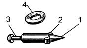 Малюнок 4. Ударник та шайба ударника: 1) жало; 2) виступи для упору шайби; 3) проточка для вилки спускового важеля; 4) шайба ударника Шайба ударника одягнена на нижній кінець ударника і є упором для нижнього кінця бойової пружини. Спусковий важіль (мал. 5) служить для утримання ударника під час зведеного положення (бойова пружина стиснута). На трубці ударного механізму спусковий важіль тримається запобіжною чекою.