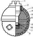 Малюнок 4. Будова ручної гранати РГО без запалу: 1) пробка; 2) манжета; 3) стакан; 4) напівсфера; 5) вибухова суміш;6) напівсфера; 7) прокладка; 8) шашка; 9,10) напівсфера. На дно заглиблення в вибухову суміш нижніх напівсфер корпусів поставлена детонаторна шашка, яка служить для передачі детонації від запалу до вибухової суміші. Для запобігання переміщенню шашки ставлять прокладку. Запал УДЗ (мал. 5) призначений для підриву вибухової суміші при ударі гранати об перешкоду. У випадку, коли датчик цілі відмовляє в ударній дії, запал спрацьовує від дистанційного пристрою через 3,3 – 4,3 с.