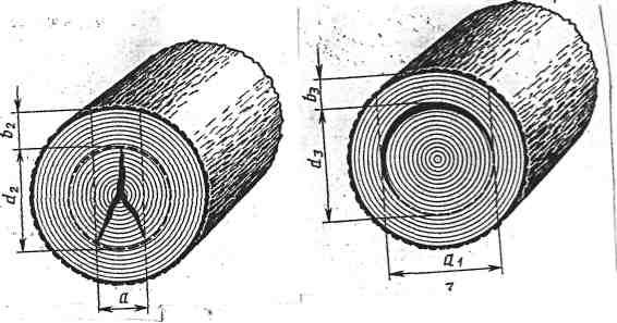 Внутреннюю заболонь измеряют: По наружному диаметру и ширине ее кольца (размеры соответственно d и а). Если это обусловлено спецификой сортимента, допускается измерять один из указанных параметров; По наименьшей ширине свободной от порока переферической зоны торца (разме b).