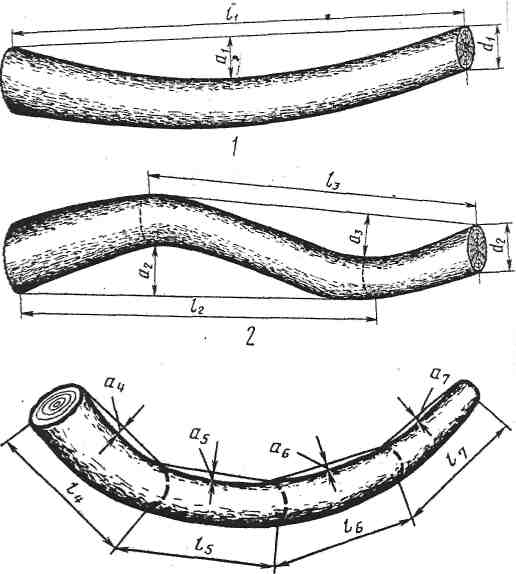 Если это обусловлено спецификой сортимента, допускается измерять один из указанных параметров. За толщину нароста принимается расстояние между поверхностью ствола и линией проходящей параллельно ей на высоте нароста. Измерение кривизны Простую кривизну измеряют по величине стрелы прогиба сортимента в месте его наибольшего искривления и выражают в целых сантиметрах и относят ко всей длине искривления, измеренной в метрах, или в процентах от длины искривления, или в долях диаметра верхнего торца (размер z1). Сложную кривизну характеризуют величиной наибольшего искривления 9 размер z2), измеряемого анологично простой кривизне. При измерении кривизны комлевых лесоматериалов размер на первом метре от нижнего торца в расчет не принимают. В круглых лесоматериалах, предназначенных для последующей разделки на чураки, кривизну измеряют отдельно для каждого чурака 9 размеры z3, z4, z5, z6).