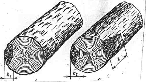 Заболонные грибные окраски, побурение и заболонную гниль измеряют: · По глубине зоны поражения от боковой поверхности (размеры h1, h2); для окоренных сортиментов – и по длине (размер l); · По площади поражения (в процентах от площади торца или площади заболони на пораженном торце); · По площади зоны поражения и ее глубине от боковой поверхности (в сантиметрах или долях диаметра торца, в процентах от площади торца или площади заболони на торце). ·