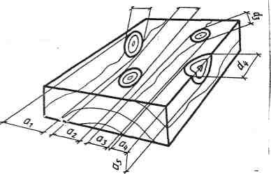 Измерение сучков Не выходящие на ребро круглые, овальные, продолговатые и разветвленные сучки измеряют:по расстоянию между касательными к контуру сучка, проведенными параллельно продольной оси сортимента (размеры а1, а2); По наименьшему диаметру разреза сучка (размерыd1, d2). Сшивные сучки, а также выходящие на ребро продолговатые и разветвленные сучки измеряют: · По расстоянию между ребром и касательной к контуру сучка, проведенной параллельно ребру, с измерением на той стороне сортимента, куда выходит поперечный разрез сучка (размер а); · По наименьшему диаметру продольного сечения сучка (размеры d1, d2). Выходящие на ребро продолговатые и разветвленные сучки, если это обусловлено спецификой сортимента, допускается измерять и по расстоянию между ребром и касательной к контуру сучка, проведенной параллельно ребру, с измерением на той стороне сортимента, куда выходит продольное сечение сучка (размер А2). Для разветвленных сучков допускается измерять, если это обусловлено спецификой сортимента, и по сумме размеров составляющих сучков с измерением каждого из них по способу, соответствующему его разновидности по форме (размеры Za,Zb,ZA).