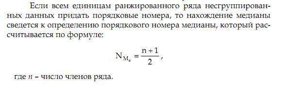 Медиана (Me) — это средняя вариантов ранжированного (упорядоченного) ряда, расположенного в определенном порядке — по возрастанию или убыванию вариантов. Она делит такой ряд пополам.
