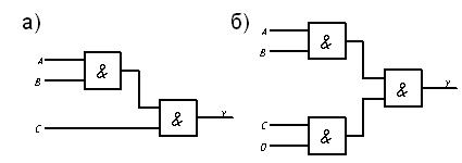 На рисунке 1.15 приведен пример получения логического элемента И с тремя входами, используя только элементы И с двумя входами. На рисунке 1.16, б показано, каким образом можно собрать логический элемент И с четырьмя входами, имея в наличии лишь логические элементы с двумя входами.
