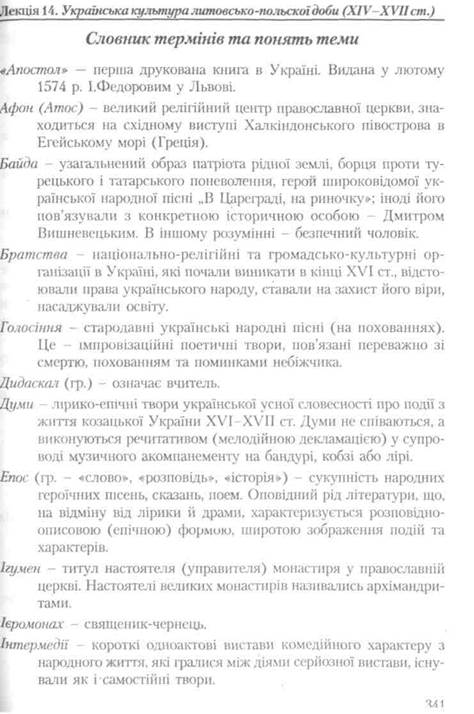 Лекція 14. Українська культура литовсько-польскої доби (XIV-XVIIcm.) Питання до самоконтролю 1. Звідки йшли впливи на українську культуру в литовсько-польську добу? 2. Як розуміти вислів М.Грушевського про «нашествіє галичан» на Київ? 3. Хто з учених - вихідців з України дістав титул довічного громадянина Болоньї? 4. Що це за Пересопницьке Євангеліє? 5. Яка була роль братств у розвитку української культури? 6. Які наслідки для розвитку культури Берестейської унії (1596)? 7. Що зробили для розвитку української культури князь Костянтин Острозький і Петро Могила? 8. Хто такий Єлисей Плетенецький? 9. Який внесок в українську культуру Мелетія Смотрицького?