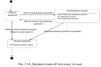 Діаграма станів (State chart dіagram) визначає усі можливі стани (state), у яких може знаходитися конкретний об’єкт під час свого існування, а також процес зміни станів цього об’єкта у результаті настання деяких подій (event). На діаграмі виокремлюють два спеціальних стани – початковий (start) і кінцевий (stop). Початковий стан виокремлюють чорною крапкою, він відповідає тільки що створеному стану об’єкта. Кінцевий стан виокремлюють чорною крапкою в білому крузі, він відповідає стану об’єкта безпосередньо перед його знищенням. На діаграмі станів може бути тільки один початковий стан і декілька кінцевих станів (або кінцевих станів може не бути взагалі). Усі інші стани зображають прямокутником із заокругленими краями. Кожен стан має дві частини. У верхній частині відображають назву стану. Назва стану може бути порожньою (анонімний стан). Нижню частину стану призначено для відображення внутрішніх дій (actions), які виконуються у відповідь на визначені події, що виникають у цьому стані. Наприклад, діаграма станів об’єкта класу Account (Рахунок) може набувати вигляду як на рис. 5.10.