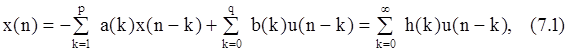 где x(n) - выходная последовательность моделирующего фильтра, u(n) - возбуждающая шумовая последовательность. Без потери общности можно положить b(0)=1 и суммировать с k=1, так как u(n) всегда можно соответствующим образом промасштабировать, чтобы учесть любой коэффициент усиления фильтра. Функциональная схема АРСС-модели приведена на рис. 7.1, а. Здесь параметры a(k) характеризуют авторегрессионную часть модели, а b(k) - часть, соответствующую скользящему среднему. Системная функция фильтра определяется выражением