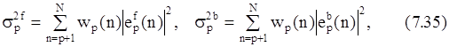 Это выражение определяет геометрическое среднее между нормированной корреляцией ошибки предсказания вперед (а) и нормированной корреляцией ошибки предсказания назад (b). Подставляя в (7.21) оценки взаимной корреляции и автокорреляции ошибок предсказания вперед и назад