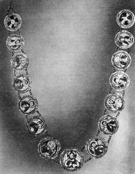 Золотое ожерелье VI в., вероятно, константинопольской работы, с изображением Христа и двенадцати апостолов {605} образы не только приобретают новые стилистические черты, но и отражают видоизменение самих сюжетов в соответствии с литературными текстами, получившими новое звучание: на блюде с изображением «Спора Аякса и Одиссея из-за оружия Ахилла» (Гос. Эрмитаж), так же как на блюде с Беллерофонтом (Музей Искусства и истории г. Женевы), имеется изображение пастуха с посохом, не находящее объяснения из текста Гомера; зато он упоминается у автора V—VI вв. Квинта Смирнского, который ведет повествование от имени пастуха 8. На ряде серебряных сосудов встречаются александрийские мотивы: сцены рыбной ловли, Посейдон (Нептун) на ручках ковшей, нереиды и др. Наиболее интересен ковш с изображением сцены «Измерение Нила» (Гос. Эрмитаж): на ручке здесь — традиционная фигура Посейдона, по бортику — крокодилы и гиппопотамы, лотосы и прочие атрибуты александрийского пейзажа, а на дне, в медальоне — два эрота, отмечающие на столбике — нилометре — уровень разлития Нила. Зарубка сделана на высоте пяти локтей (буква «Е») — уровне, весьма неблагоприятном для Египта: в этом сказалась, очевидно, неосведомленность мастера-чужестранца. Многие серебряные сосуды с изображением религиозных сцен использовались в качестве церковной утвари — дискосы и потиры, сосуды, служившие для омовения рук священника, и др. Среди них выделяется большая группа памятников VII в. с изображением сцен из истории Давида (часть из них была найдена и находится на Кипре, другие хранятся в Нью-Йорке, в Музее Метрополитен): сражение Давида и Голиафа, обручение Давида, Давид, борющийся со львом и медведем, и ряд других. Они приблизительно современны «византийскому антику» и достаточно ему близки стилистически и иконографически. Существует предположение, что эти сосуды с клеймами императора Ираклия изображали в образе Давида самого Ираклия 9. В позднейших византийских миниатюрах подобные сюжеты использовались, по-видимому, в качестве прототипов. На Кипре был найден и сосуд середины VII в. с изображением на дне полуфигуры юного святого, возможно, Сергия или Вакха: по типу и украшениям — гривне (мангаку) на шее и фибуле на плече — этот образ напоминает братьев-святых на киевской иконе. Исполненный в высоком рельефе с тонкими градациями в проработке поверхности, украшенный заполняющим медальон тончайшим (черновым) орнаментом, этот памятник является одним из выдающихся образцов чеканного искусства (Лондон, Британский музей). Антикизирующее направление в торевтике VI—VII вв. не было единственным. Ряд предметов культового назначения по иконографии и чертам стиля сближается с сирийскими памятниками; особенно ярко представляют это течение две патены, найденные на территории Сирии (в Стуме и Рихе: первая хранится в Археологическом музее в Стамбуле, {606} вторая — в собрании Думбартон-Окс в Вашингто-