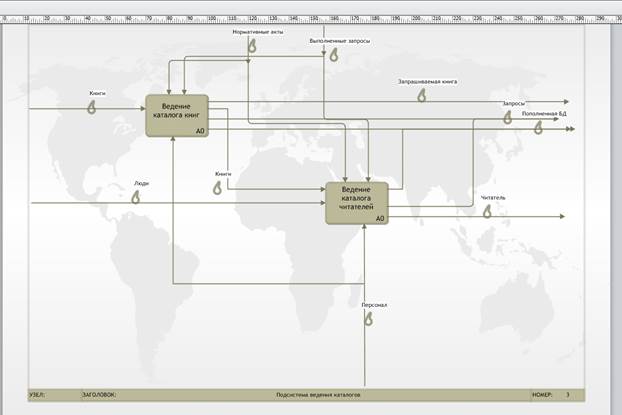 Поисковая подсистема занимается непосредственной обработкой запросов от системы или запросов из вне, а так же предоставлением информации по этим запросам. Система формирования заказов, занимается продажей книг клиентам, не является основной для разрабатываемой библиотечной системы, обеспечивает коммерческую деятельность данного учреждения. Подсистема ведения каталогов состоит из двух основных элементов: ведение каталога книг; ведение каталога читателей. На входы этих элементов системы идут книги и люди соответственно. Управляющими воздействиями являются нормативные акты и полученные данные на ранее заданные запросы (выполненные запросы). Работу этих элементов обеспечивает персонал. Выполнение этих процессов дают системе информацию, которая будет записываться в Базу Данных, тем самым получается информационная привязка книг и людей к этой библиотечной системе рис.3.