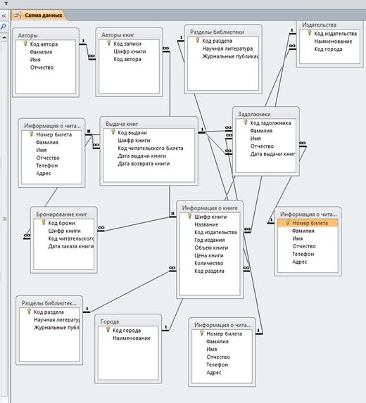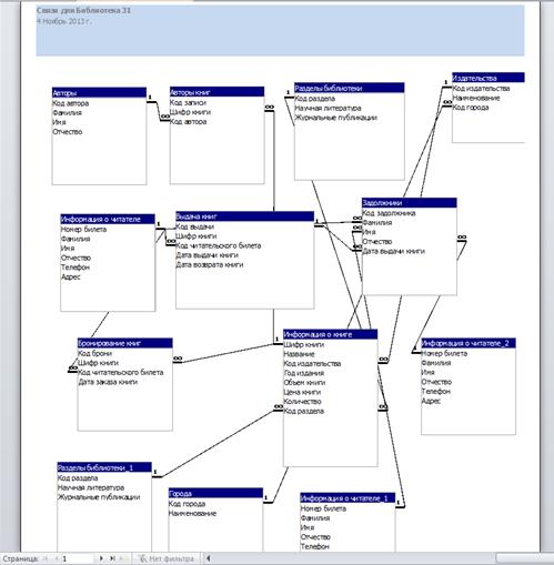 Рисунок 26– Схема данных Все таблицы связаны между собой связью типа "Один-ко-многим". На примере таблиц "Издательства" и "Города" это означает, что одно издательство может иметь только один город, но в таблице "Издательства" может присутствовать множество записей таблицы "Города". Т.е. разные издательства могут иметь одинаковые названия городов. Отчет по схеме: