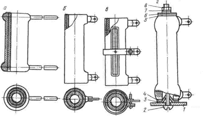 а — ПЭ; б — ПЭВ; в — ПЭВР; г — крепление резистора: 1— шасси; 2 — винт; 3 — шайба фасонная; 4,5 — шайбы изоляционные; 6,7 — шайбы металлические; 8 — гайка.