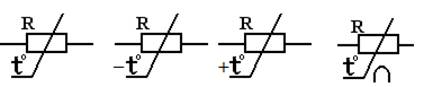 а) б) в) Рис. 2.3. Условное изображение терморезисторов: а) общее графическое изображение; б) термистор (терморезистор с отрицательным ТКС); в) позистор (терморезистор с положительным ТКС); г) терморезисторов с косвенным подогревом.