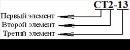 Условное обозначение терморезисторов. В настоящее время промышленностью изготовляются терморезисторы соответствующие трем различным ГОСТАм: ГОСТ 13453-64, ГОСТ 13453-68, ГОСТ 17598-72. Кроме действующих стандартов терморезисторы изготавливаются различными производителями, у которых собственная система условного обозначения. Согласно действующему стандарту (ГОСТ 13453-64, ГОСТ 13453-68, ГОСТ 17598-72) условное обозначение резисторов состоит из следующих элементов.