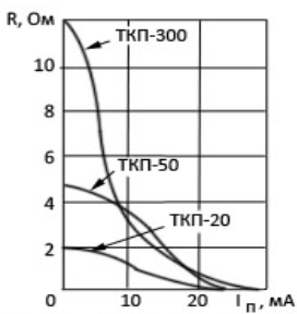 Вид ВАХ терморезисторов косвенного подогрева в значительной степени зависит от тока, протекающего по обмотке подогрева Іп. Поэтому для них обычно приводятся характеристики подогрева, устанавливающие связь между сопротивлением терморезистора и мощностью, рассеиваемой на обмотке подогрева.