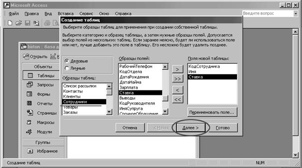 Зі зразків таблиць вибираємо придатну таблицю "Сотрудники". У зразках полів знаходимо найбільш придатні – “Код сотрудника”,” “Имя “, “Ставка” і переміщаємо їх у наш шаблон по черзі. Після цього клацаємо по кнопці " Далее >".