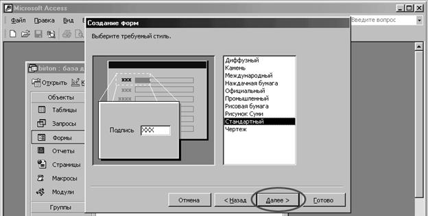У відповідь на пропозицію у наступному вікні ”Создание форм” обрати стиль форми, обираємо “стандартний” з тих самих міркувань. Продовжуємо роботу натисканням на кнопку " Далее >".