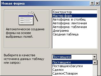 Для создание форм: 1. Щелкнуть на вкладку ФОРМЫ окна БД. 2. Щелкнуть на кнопку Создать. 3. В диалоговом окне НОВАЯ ФОРМА выбрать Мастер форм и в качестве источника данных нужную таблицу или запрос. 4. Отвечать на предлагаемые мастером диалоговые окна и нажамать кнопку Далее, пока эта кнопка активно и кнопку Готово, когда кнопка Далее уже не активна. Форма имеет 3 рабочих режима, которые можно переключать, выбрав из списка кнопки ВИД. В Режиме формы можно вводить данные, изменять их и т.д. Режим таблицы формы – это источник записи формы.
