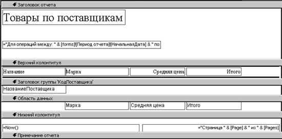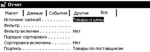 3. Создать отчет на основе запроса "Товары и цены" Отчеты создаются мастером отчетов на вкладке ОТЧЕТЫ при нажатии кнопки Создать. Отчет "Товары по поставщикам" (вид в конструкторе)