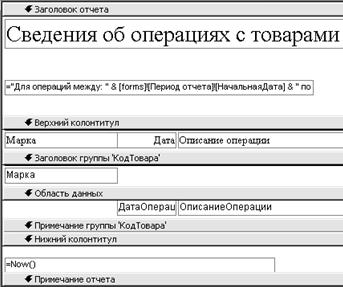 5. Создать отчеты на основе запроса "Марки товаров" Отчет "Сведения об операциях с товарами" Вид отчета в конструкторе Основные свойства отчета