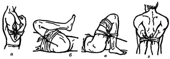Рис.7 – Максимальное сгибание конечности в суставе для остановки кровотечения: а) локтевой; б) бедренной; в) подколенной; г)подключичной артерии