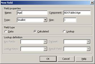В разделе Field properties (свойства поля) вы должны указать имя поля (Name) - в нашем случае назовем это поле Age, тип данных (Туре) - в нашем случае это Smallint, и для некоторых типов - размер (Size). Размер указывается для строк и других полей неопределенных размеров. После ввода всех данных проверьте, переключилась ли группа радиокнопок Field type на Calculated (это переключение делается автоматически). Затем щелкните на ОК и вы вернетесь в окно Редактора Полей, причем там появится новое поле Age. Задайте для него в Инспекторе Объектов значение DisplayLabel равным «Возраст». Вы ввели вычисляемое поле Age, но еще не указали программе, как его надо вычислять. Чтобы указать процедуру вычислений, выйдите из Редактора Полей, выделите ADOTable1,перейдите в Инспекторе Объектов на страницу событий и щелкните на событии OnCalcFields. Это событие наступает каждый раз, как надо обновить значение вычисляемых полей таблицы. Чтобы вычислить возраст по году рождения, вы можете в обработчике этого события написать оператор: