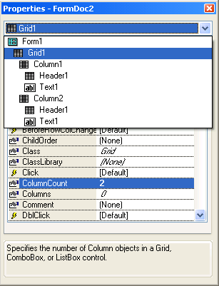 Обратите внимание, что при установке значения свойства ColumnCount больше 0, в окне Properties станут доступны свойства подобъектов (рис. 11). Из рисунка видно, что сам компонент Grid состоит из составных объектов Column, которые в свою очередь состоят из подобъектов Header и Text. Для редактирования свойств подобъекта Grid’а необходимо его выбрать в ниспадающем списке окна Properties.