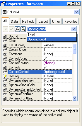 У объектов типа Column наиболее значимым является свойство ControlSource, которое определяет источник данных для столбца, а точнее, название таблицы и поля, разделенные точкой, из которого будут браться данные для отображения, например Ordsaled.icdOrder. У столбцов так же существует свойство видимости Visible, используя которое можно скрывать от пользователя данные, которые он не должен видеть. Каждый столбец имеет заголовок Header, который определяет надпись вверху столбца. За текст надписи отвечает свойство объекта Header Caption. Значение надписи заголовка столбца может быть установлено как в режиме разработки путем явного указания текста в свойствах объекта, так и в процессе работы с формой посредством явного присваивания свойства, например: thisform.Grid1.Column1.Header1.Caption=”Новый текст заголовка” если новая надпись превышает размер заголовка на экране, будет выведено только ее начало, помещающееся в существующий размер. Для вывода всей надписи следует увеличить размер столбца, однако при этом столбцы могут перестать помещаться в области экранной видимости компонента Grid и пользователю придется использовать нижнюю полосу прокрутки для получения доступа к столбцам, находящимся в правой части. Подобъект Text каждого столбца, является объектом ввода Text Box и обладает всеми его свойствами. (Свойства Text Box описаны в предыдущей работе.) Существует возможность расширения набора типов компонентов столбца, т.е. вместо текстового поля отображать в столбце Grid’а другие объекты. Для этого необходимо в режиме конструктора форм выбрать компонент Grid, правой кнопкой мыши вызвать контекстное меню и выбрать пункт Edit (рис 12). При этом система перейдет в режим редактирования составного объекта, о чем будет свидетельствовать визуальное изменение рамки выбранного объекта (вместо точек изменения размера объекта на экране появится цветная полосатая рамочка вокруг объекта). После этого на панели Form Controls нужно выбрать добавляемый компонент и левой кнопкой мыши щелкнуть на столбце Grid, в который будет добавлен выбранный компонент. После этого в свойстве столбца Grid CurrentControl появится возможность выбора текущего типа объекта столбца (рис. 13). Работа с новым типом производится в стандартном режиме. При запуске формы новый тип объекта по умолчанию будет отображаться только в текущей строке. Для управления отображением служит свойство столбца Sparse, изначальное значение которого True. Установив значение этого свойства False, разработчик может принудительно заставить систему отображать новый тип объекта в каждой строке Grid. В случае, если высоты строки для отображения нового типа объекта недостаточно ее следует увеличить путем изменения значения свойства Grid RowHeight.