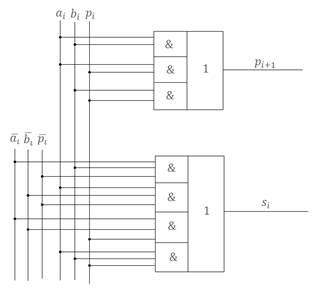 В теории цифровых устройств комбинационной логикой (комбинационной схемой) называют логику функционирования устройств комбинационного типа. У комбинационных устройств состояние выхода однозначно определяется набором входных сигналов. Это отличает комбинационную логику от секвенциальной логики, в рамках которой выходное значение зависит не только от текущего входного воздействия, но и от предыстории функционирования цифрового устройства. Другими словами, секвенциальная логика предполагает наличие памяти, которая в комбинационной логике не предусмотрена. Целью лабораторной работы является изучение принципов работы комбинационных схем: сумматоров, дешифраторов, мультиплексоров. Сумматор – узел, выполняющий арифметическое суммирование кодов чисел, обычно представляющий собой комбинацию одноразрядных сумматорных схем. При сложении 2-х чисел в каждом разряде складываются 3 цифры: цифра данного разряда 1-го числа, цифра данного разряда 2-го числа, сигнал переноса из младшего разряда. В результате сложения для каждого разряда получается цифра разряда и сигнал переноса в старший разряд. Таблица истинности работы одноразрядного сумматора имеет вид