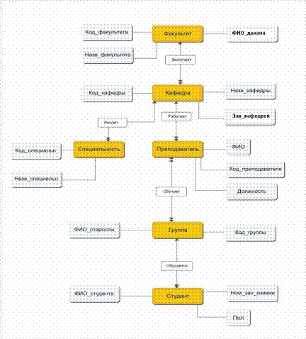 Схема, состоит из следующих компонентов: · шести сущностей, которые изображены прямоугольниками, каждый из которых имеет свои атрибуты, помещенные в овалы, а в нижеприведенном списке они перечислены в скобках рядом с именем сущностей: ФАКУЛЬТЕТ: (Код_факультета, Назв_факультета, ФИО_декана); КАФЕДРА: (Назв_кафедры, Зав_кафедрой); СПЕЦИАЛЬНОСТЬ: (Код_специальности); ПРЕПОДАВАТЕЛЬ: (ФИО, Должность); ГРУППА: (Код_группы, ФИО_старосты); СТУДЕНТ: (Ном_зач_книжки, ФИО); · пяти связей, которые обозначены стрелками и связывают те сущности, на которые они направлены: связь ВКЛЮЧАЕТ показывает, что на факультете несколько кафедр; связь ВХОДИТ изображает, что одна и та же кафедра готовит специалистов по нескольким специальностям; связь РАБОТАЕТ определяет то, что на кафедре работает ряд преподавателей; связь ОБУЧАЕТ с двойными стрелками в обоих направлениях поясняет тот факт, что один и тот же преподаватель преподает в разных группах, а одна и та же группа занимается с разными преподавателями; связь ОБУЧАЕТСЯ определяет, что каждая группа включает в себя ряд студентов. Из представленной диаграммы понятно, что данные обладают определенной структурой. Для выявления этой структуры база данных должна пройти процесс проектирования. Проектируемая БД должна обладать определенными свойствами. Назовем основные свойства БД. · Целостность понимается как правильность (непротиворечивость) данных в любой момент времени (в каждый момент времени существования БД сведения, содержащиеся в ней, должны быть непротиворечивы). Поддержание целостности БД может рассматриваться как защита данных от неверных изменений или разрушений. Установить проверку целостности данных можно, если выполнены следующие условия: