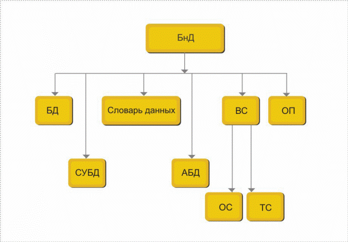 Дадим краткие определения новым составляющим этой схемы. Словарь или каталог данных служит для централизованного накопления и описания ресурса данных. Он содержит описание ПрО, сведения о структуре БД, о связях между элементами БД. Словарь данных можно рассматривать как часть самой базы данных. Администратор БД (АБД) — человек или группа лиц, которые принимают решения. Основные функции АБД: · участие в разработке БД; · контроль правильности функционирования БД. Вычислительная система (ВС) — включает программные (ПС) и аппаратные средства (ТС). Обслуживающий персонал (ОП) — это лица, прямыми обязанностями которых является создание и поддержание корректного функционирования банка данных. Они ответственны за работу БнД и прикладного программного обеспечения. К обслуживающему персоналу относятся: разработчики и администраторы базы данных, аналитики, программисты.