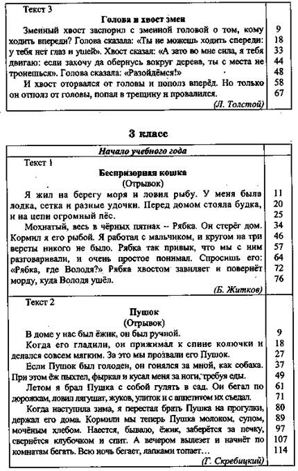 Материал для обследования чтения Некоторые тексты для проверки навыка чтения предложены авторами В.Г. Горецким, Л.И. Тикуновой. Обследование чтения должно проходить в спокойной, доброжелательной обстановке. При этом не следует акцентировать внимание школьника на том, что в данный момент идет проверка навыка чтения. Не рекомендуется останавливать его в середине текста, а необходимо дать возможность ребенку дочитать предложенный материал до конца. Справа от текста указано количество слов в каждой строке. Это поможет специалисту отметить количество слов, прочитанных за 1 минуту, во время чтения, не прерывая ребенка.