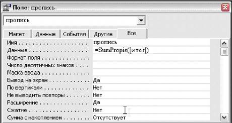 3.2. В поле b надпись поля следует выделить и удалить, а для самого поля присвоить имя пропись (рис. 8.4). В качестве данных будем использовать пользовательскую функцию SumPropis, которая осуществляет прописывание прописью числового данного, заданного в качестве ее аргумента. Поскольку поле итог может содержать достаточно большое число, для текстовой записи может не хватить предусмотренного размера поля, который можно расширить, если установить параметр свойства Расширение в значение Да.