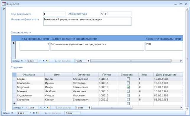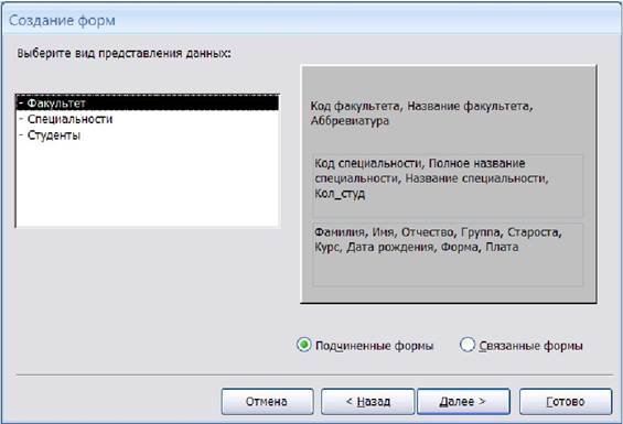 Работа с такой формой позволяет выбирать факультет, листать список специальностей и для каждой просматривать списки студентов. Форма разрабатывается Мастером, в котором вначале загружаются все поля из таблицы Факультет, затем все поля, кроме Код факультета, из таблицы Специальности, и, наконец, все поля, кроме Код специальности и 83