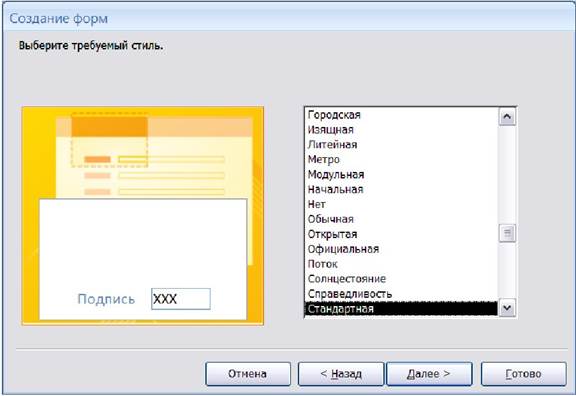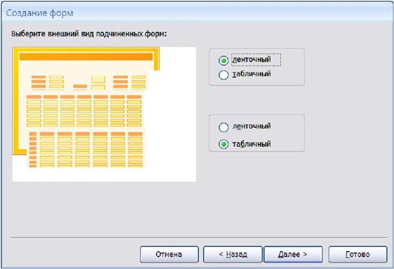 Выбираем вид представления данных, внешний вид подчиненных форм (ленточный для Специальности и табличный для Студенты) и стиль Стандартная.