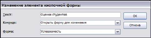 Рис. 11.3. Изменение элемента кнопочной формы После создания всех страниц кнопочной формы и элементов на каждой странице диспетчер закрывают, а в базе данных будет создана кнопочная форма и таблица Switchboard Items, которая описывает иерархические уровни страниц формы, а также подписи и действия кнопок формы. Кроме того в процессе работы диспетчера кнопочных форм Access создает необходимые процедуры обработки событий, которые обеспечивают работу кнопочной формы. Кнопочную форму можно открыть в режиме конструктора и изменить фон, добавить рисунки, подписи. Ни в коем случае нельзя изменять или удалять кнопки и надписи рядом с ними, так как после этого форма не будет работать. Для работы с базой данных удобно, когда кнопочная форма автоматически открывается при открытии базы данных. Чтобы включить эту возможность, нужно открыть Параметры Access, выбрать категорию Текущая база данных, раскрыть список Форма просмотра и выбрать Кнопочная форма.