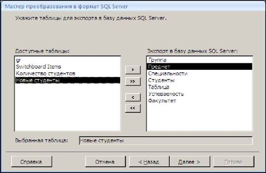 На третьем шаге (рис.14.4), используя кнопки для перемещения, выберем в левом окне из списка доступных таблиц основные таблицы (Факультет, Специальности, Студенты, Успеваемость, Группа и Предмет) и переместим их в правое окно для экспорта в SQL Server.