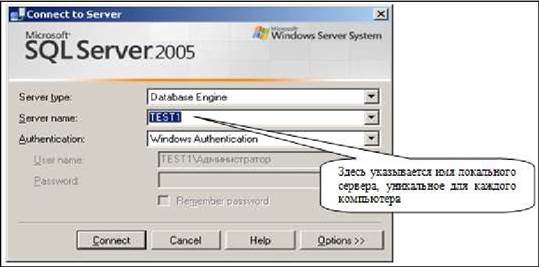 Теперь закроем MS Access и начнем работу с базой данных в локальной СУБД SQL Server 2005. Напомним, что каждый SQL Server имеет уникальное имя, как правило, совпадающее с именем компьютера, на котором он исполняется. Для работы с SQL Server 2005 используем менеджер, запуск которого производим из меню кнопки ПускMicrosoft SQL Server 2005 ® SQL Server Management Studio. Представленное на рисунке 14.9 окно позволяет осуществить присоединение к серверу (Connect to Server). Мы будем использовать локальный сервер, установленный на каждый компьютер, нам достаточно выбрать его имя, указать способ доступа с правами пользователя-владельца (Windows Authentication) и нажать кнопку Connect.
