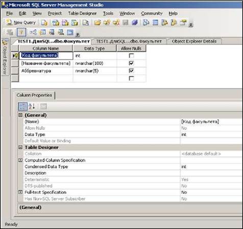 Контекстное меню Design для таблицы Факультет позволит перевести ее в режим Конструктора (рис.14.13), в котором, как и в MS Access, можно корректировать поля таблицы, настраивать их свойства и назначать ключи.