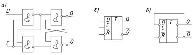 Текущее состояние Т – триггера определяется не информацией на входе, о его состоянием в предыдущем такте. Т – триггер достаточно просто можно образовать из D – триггера, соединив его инверсный выход Q c D – входом, как показано на рис. 5,в.