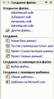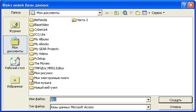 Рис. 5.1. Окно Создание БД Если по какой-либо причине окно не выводится, то следует выполнить команду Файл → Создание или воспользоваться кнопкой создать базу данных на панели инструментов. 2. В окне СОЗДАНИЕ базы данных выбрать закладку Новая база данных. 3. В появившемся окне Файл новая база данных (рис.5.2.) следует выбрать палку для размещения файла (по умолчанию файл будет сохранен в папке Мои документы - воспользуемся ею) или создать свою, затем задать имя файла новой базы данных - СКЛАД и нажать кнопку Создать (тип файла по умолчанию имеет значение База данных, что придает файлу расширение.mdb).
