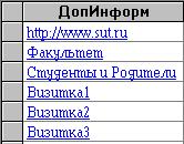 Задание 15. Гиперссылки и объекты OLE Цель: Изучение методов работы с гиперссылками и объектами, созданными внешними приложениями. 1. Открыть базу данных База№13 и убедиться в наличии таблицы Студенты, содержащей в себе не менее шести записей. 2. Создать в таблице Студенты новое поле ДопИнформ, имеющее тип Гиперссылка. 3. Заполнить поле ДопИнформ следующими данными: 3.1. Для первого студента в режиме таблицы ввести в поле ДопИнформ ссылку на - http://www.perm.ru/. 3.2. Для второго студента создать гиперссылкуy на любой текстовый файл. 3.3. Для третьего студента разместить ссылку на отчет ОтчетСтудентыРодители. 3.3.1. В диалоговом окне Изменение гиперссылки выбрать вкладку Связать с объектом базы данных и указать отчет ОтчетСтудентыРодители. В качестве имени гиперссылки ввести «Студенты и Родители», а в качестве всплывающей подсказки – «Ссылка на отчет». 3.4. Создать для следующих трех студентов файлы с визитными карточками и установить на них гиперссылки. 3.4.1. В текстовом редакторе MS Word создать три документа с именами Визитка1, Визитка2 и Визитка3 по приведенному на рис.15.1 образцу. 3.4.2.Для каждой из трех записей в диалоговом окне Изменение гиперссылки в поле Текст ввести «Визитка», а ссылку на файл создать, воспользовавшись окном Связать с файлом (кнопка Файл). 4. Убедиться в работоспособности всех шести созданных гиперссылок (рис.15.2), поочередно обратившись к сайтам, к отчету и к документам Word. 5. Создать в таблице Студенты новое поле Визитка, имеющее тип поле объекта OLE.