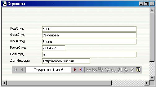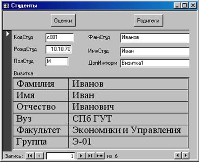 Рис. 15.3 7. Изменить форму Студенты добавив в нее поле ДопИнформ и поле Визитка в соответствии с рис.15.4. 8. Просмотреть содержимое созданных полей через форму. 9. Открыть файл Визитка1 через гиперссылку и изменить для соответствующего студента номер группы. Пронаблюдать, отобразились ли изменения в поле Визитка. 10. Сделать вывод о возможностях и сферах применения полей гиперссылок и полей объектов OLE. 11. Сохранить базу данных на диске для дальнейшего использования.
