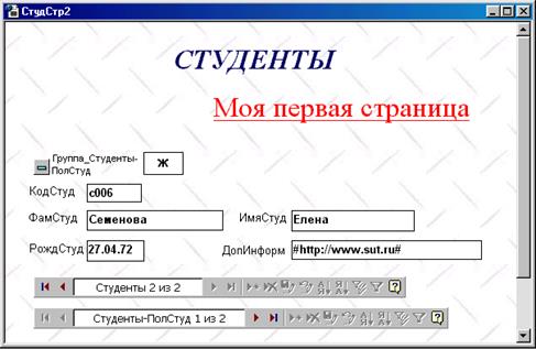 Цель: Изучение способов создания страниц доступа к данным. 1. Открыть базу данных База№13. 2. Создать страницу доступа к данным наоснове таблицы Студенты с помощью Автостраницы по образцу, приведенному на рис.17.1. 2.1. Перейти на вкладку Страницы, в меню Создать выбрать пункт Автостраница: в столбец, а в качестве источника определить таблицу Студенты. 2.2. Проанализировать возможности, предоставляемые созданной страницей по вводу и редактированию данных, попытавшись ввести дополнительные данные о студентах. 2.3. Выполнить дополнительную обработку отображаемых данных, используя кнопки на панели инструментов страницы доступа к данным. 2.3.1. Последовательно отсортировать данные по полю ПолСтуд и 2.3.2. Применить Фильтр по выделенному для отображения только студентов женского пола.