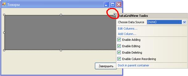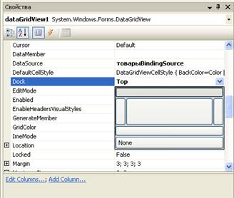 Флаг Enable Editing управляет разрешением пользователю редактировать данные в таблице. Если необходимо запретить редактирование не во всей таблице, а в конкретном поле, то для этого в окне Edit Columns устанавливается значение True для свойства ReadOnly. Флаг Enable Deleting управляет разрешением удалять строки пользователем. Флаг Enable Reordering управляет разрешением изменять порядок расположения столбцов пользователем во время сеанса. Ссылка Dock in harent container размещает таблицу на всё окно формы. Свойство Dock элемента DataGridView позволяет привязывать таблицу к различным краям формы: