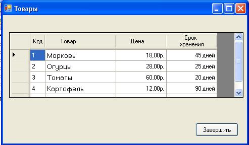 1. Что такое ADO.NET? 2. С какими СУБД работает ADO.NET? 3. Какие виды соединений обеспечивает ADO.NET? 4. Каковы достоинства и недостатки каждого вида соединений? 5. Перечислите основные классы ADO.NET. 6. Каково назначение объектов класса Command? 7. Какой класс обеспечивает чтение при постоянном соединении с базой данных? 8. Что такое «провайдер данных»? Нарисуйте классовую структуру провайдера данных. 9. Функции, выполняемые объектами класса DataSet. 10. Какие коллекции имеют объекты класса DataSet? Какие объекты составляют эти коллекции? 11. Назначение класса DataRelation и его коллекции Relations. 12. Назначение объектов класса DataAdapter. Как определить необходимое количество объектов DataAdapter для объекта DataSet? 13. Каково назначение свойства DataSource элемента управления BindingSource? 14. Почему для СУБД Oracle и SQL Server существуют разные провайдеры? 15. В чём особенность провайдеров для OLE DB и ODBC? 16. Каково назначение элемента управления DataGridView? 17. Как разрешить пользователю перетаскивать колонки таблицы? 18. Почему пользователь не может ввести новую строку в таблицу? 1. Создать базу данных MS ACCESS для учёта поступления товаров в соответствии с 2. Создать с помощью MS Visual Studio Windows – приложение на языке C#. 3. С помощью элемента управления BindingSource произвести и проверить подключение к созданной базе данных. 4. Разместите на форме элемент управления DataGridView и настройте его на отображение запроса (представления) «Сроки хранения». 5. Поместите таблицу на форму удобно для пользователя, используя свойство Dock.. 6. Отформатируйте колонки для удобной работы пользователя. 7. В созданной таблице проверьте пользовательскую работу по вводу и редактированию строк.