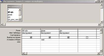 Рис.8. Пример запроса. На рис.8 представлен пример, в котором мы хотим отобрать из всех инструментов тот, у которого диаметр более 60 мм. Другие виды запросов. Мы рассмотрели запросы на выборку. Это самые простые и в то же время наиболее распространенные виды запросов. Однако существуют и другие виды, некоторые из которых выполняются на базе предварительно созданного запроса на выборку. К ним относятся прежде всего: · запросы с параметром (интересны тем, что критерий отбора может задать сам пользователь, введя нужный параметр при вызове запроса); · итоговые запросы, назначение которых отдаленно напоминает итоговые функции электронных таблиц (производят математические вычисления по заданному полю и выдают результат); · запросы на изменение – позволяют автоматизировать заполнение полей таблиц; · перекрестные запросы, позволяющие создавать результирующие таблицы на основе результатов расчетов, полученных при анализе группы таблиц; · специфические запросы SQL – запросы к серверу базы данных, написанные на языке запросов SQL. Можно осуществлять анализ данных с помощью запросов с вычислениями. Для этого вставляется в поле выражение, чтобы отобразить результат выполнения вычисления. Например, выражение [Цена ]*1,25 определяет увеличение цены на четверть. Перекрестный запрос представляет собой эффективное средство анализа информации. Помимо строк и столбцов для сгруппированных данных, результаты перекрестного запроса включают дополнительный столбец для итоговых значений. Мастер перекрестных запросов позволяет выбирать таблицы и запросы, содержащие исходные данные, указывать поля, образующие строки и столбцы запроса, а также задавать поля и выражения для расчета значений в ячейках на пересечении строк и столбцов. Процесс построения запроса отображается на диаграмме внизу окна «Мастера».
