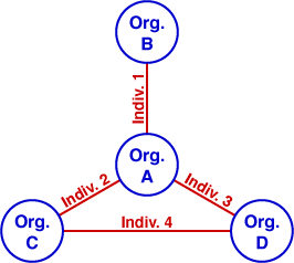 На Рис. 4 видно, что организация «А» находится в центре сети в силу наибольшего количества связей между данными индивидами. Рис. 5. Гипотетическая межличностная сеть, образованная на основе общей организационной принадлежности.